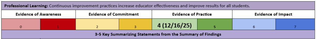 | Leadership supports professional learning, as demonstrated by the strong system of instructional coaching and peer coaching across the district. | Leadership transitions provide the district an opportunity to fully align professional learning practices across the buildings, such as common expectations for PLCs, data dives, and reviews of walkthrough data. |